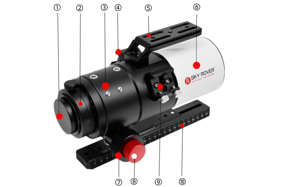 (6) Dewshield (7) Coarse focus wheel (8) Fine focus wheel (9) Finder base (10)Dovetail plate