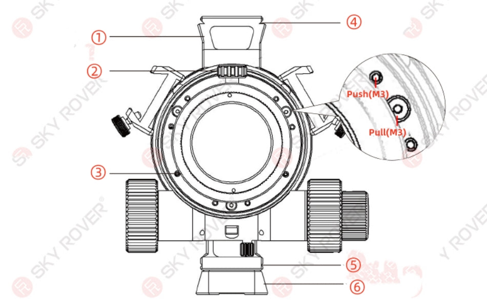 (1) Thread interface (2) CAA (3) Focuser (4) Finder base (5)Handle