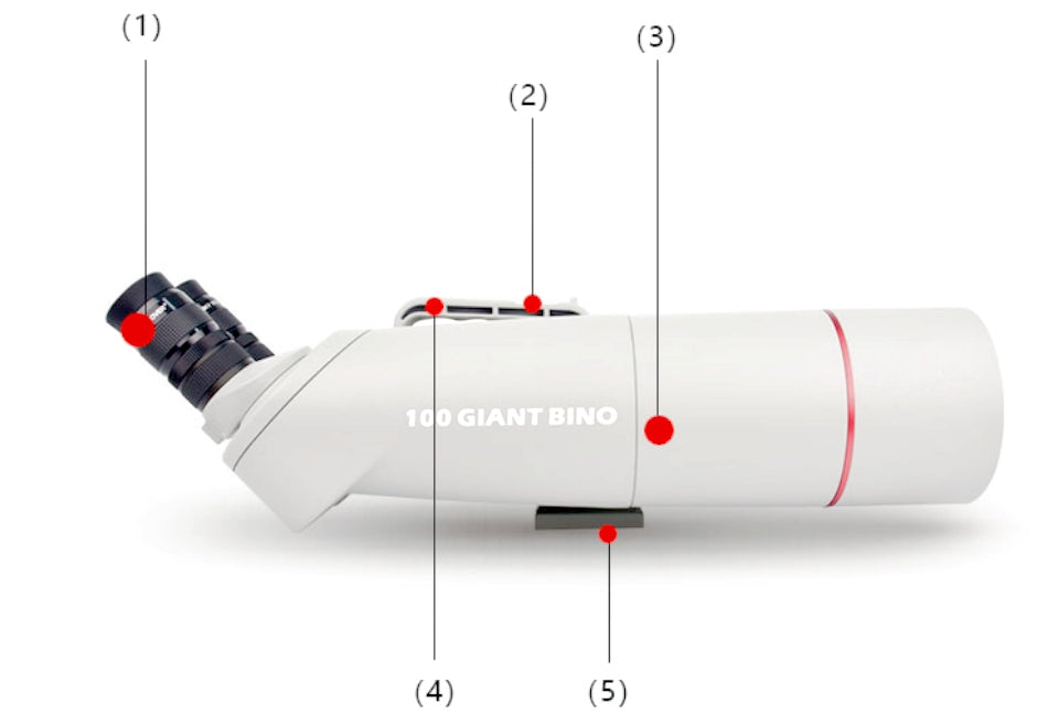 (1) UF18mm eyepieces (2) Hole for finder installation (3) Aluminum magnesium alloy body (4) Portable handle (5) Connector for base