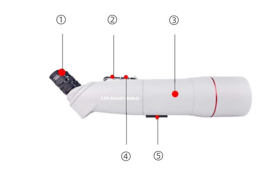 (1) UF18mm eyepieces (2) Portable handle (3) Aluminum magnesium alloy body (4) Hole for finder installation (5) Connector for base