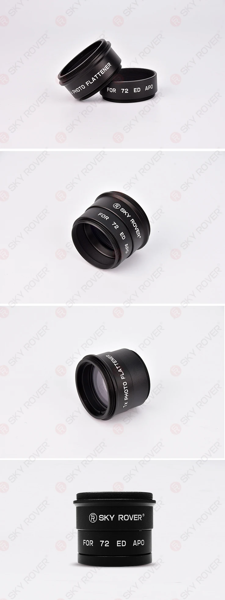 SKY ROVER specially designed a 1X field flattener for photography for 72ED APO. It is connected with the telescope by threaded connection (M54x0.75, when in use, the 2-inch connector on CAA should be rotated and removed), and it is matched with the image field rotator (CAA) at the tail of the focusing tube, so it can meet your composition requirements without rotating the main mirror. At the same time, its lens body adopts two-section design, and the default factory is SLR camera shooting mode. If you use CCD/CMOS, you can remove the SLR adapter and install the flattener before using.