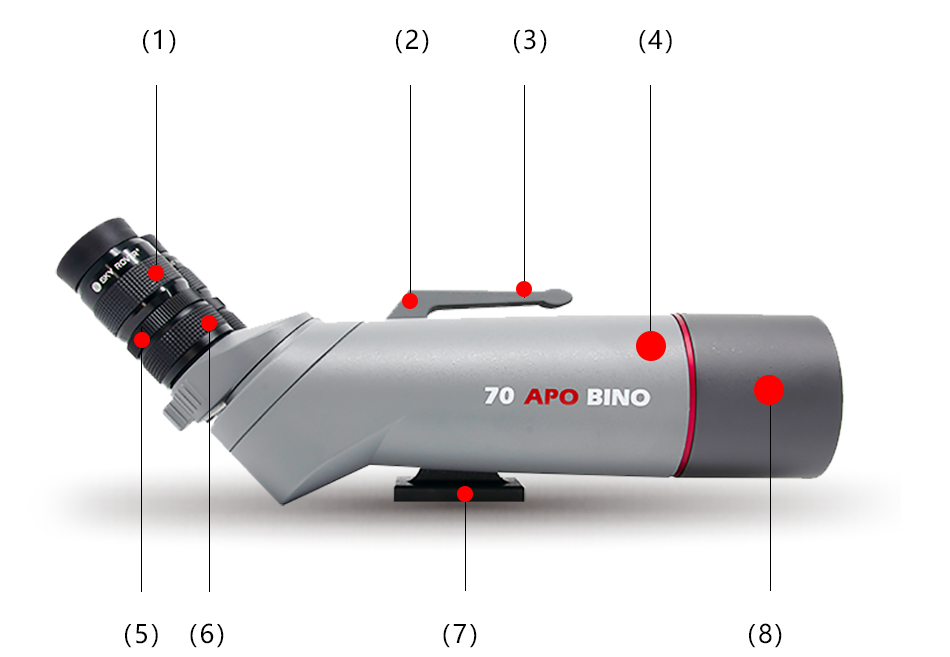 (1) UF18mm eyepieces (2) Portable handle (3) Hole for finder installation (M5) (4) Aluminum magnesium alloy body